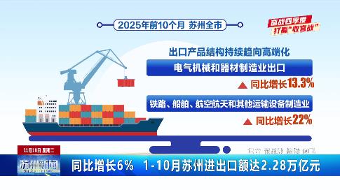 同比增長(zhǎng)6% 1-10月蘇州進(jìn)出口額達(dá)2.28萬(wàn)億元